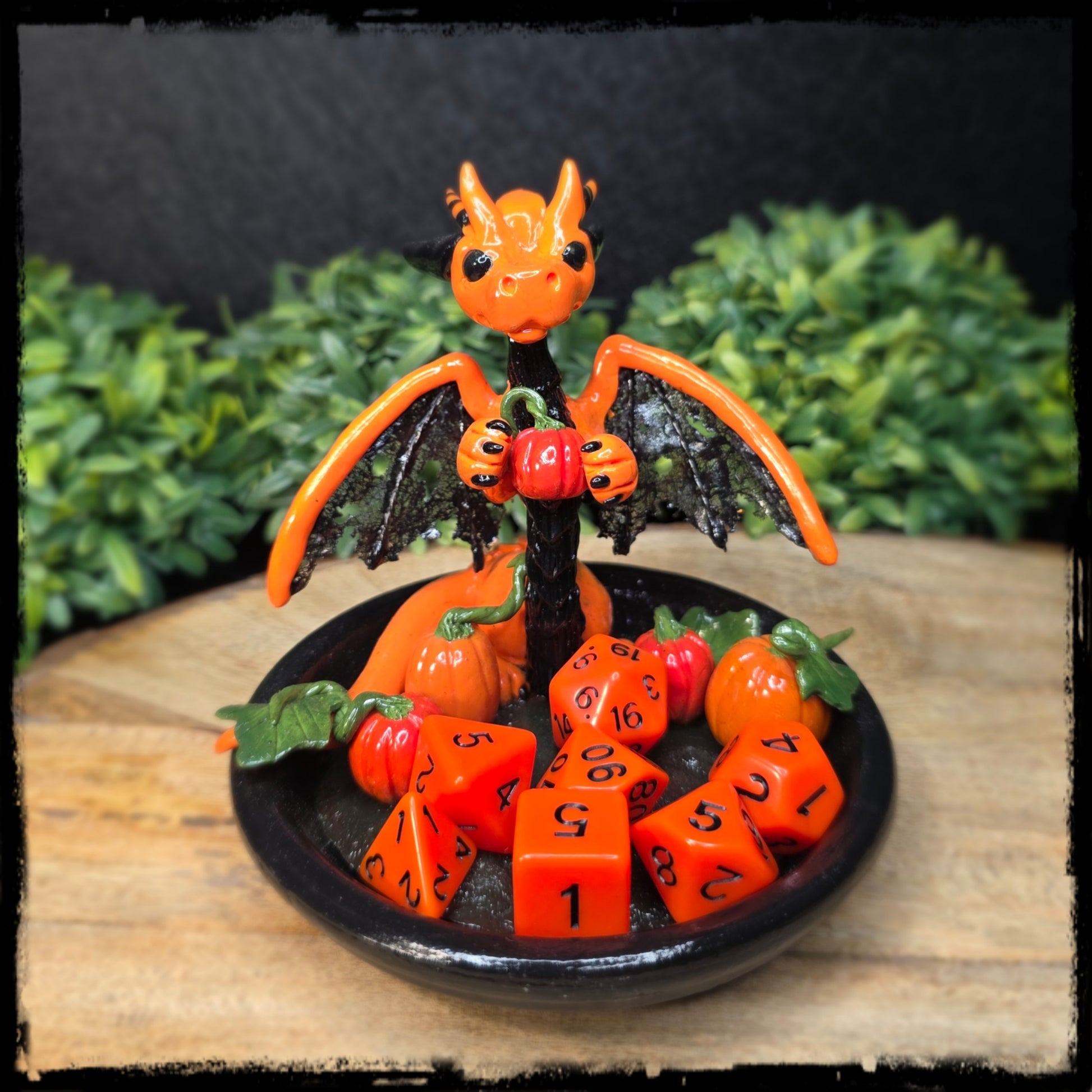 This sculpture is lovingly handcrafted from polymer clay and finished with a gloss varnish. Ceramic tray painted with acrylics. DIce set included. Includes an artist signed adoption certificate of authenticity. Size of dragon is approximately 4 1/4 inches wide, and 4 3/4 inches high.