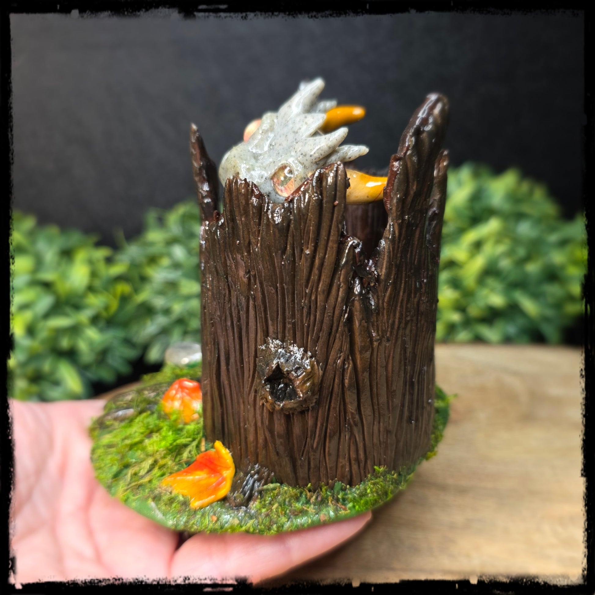 This sculpture is lovingly handcrafted from polymer clay and finished with a gloss varnish. Accented with moss. Includes an artist signed adoption certificate of authenticity. Size of dragon is approximately 3 3/4 inches wide, and 3 3/4 inches high.