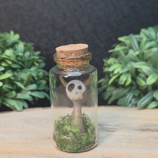 Skullee-Wagz™ are handcrafted from polymer clay. Glass jar is approximately 1 1/4 inches wide and 2 3/4 inches high and accented with moss. Do not open.