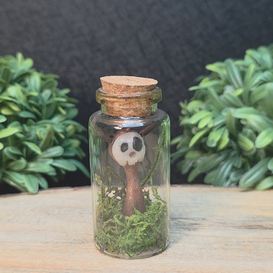 Skullee-Wagz™ are handcrafted from polymer clay. Glass jar is approximately 1 1/4 inches wide and 2 3/4 inches high and accented with moss. Do not open.