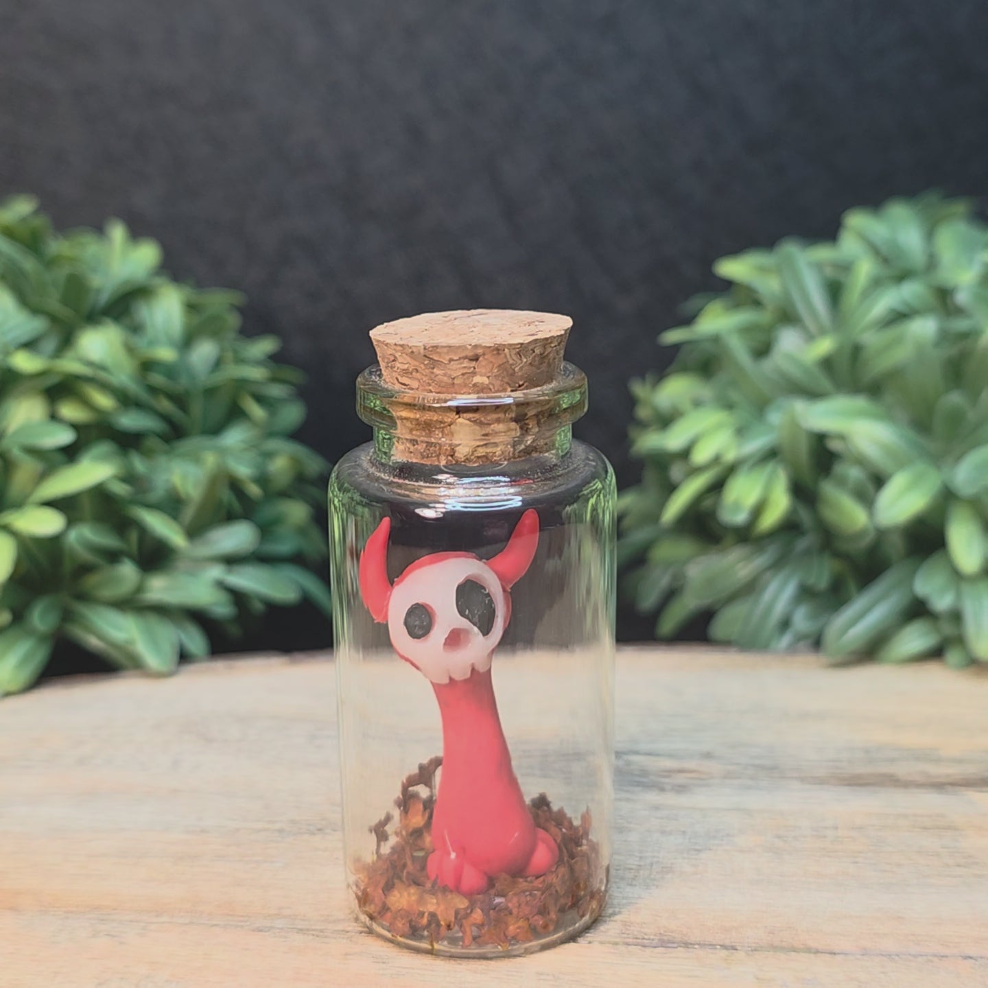 Skullee-Wagz™ are handcrafted from polymer clay. Glass jar is approximately 1 1/4 inches wide and 2 3/4 inches high and accented with moss. Do not open.