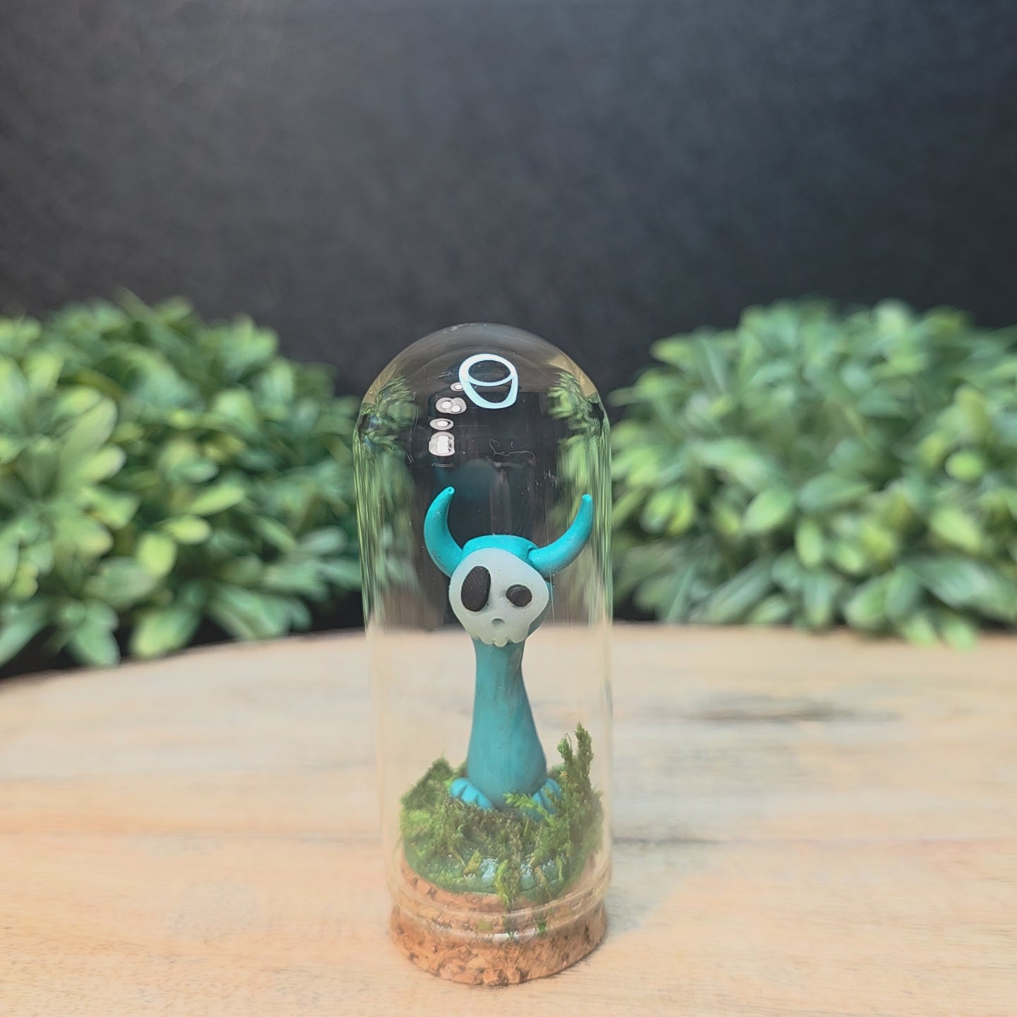 Skullee-Wagz™ are handcrafted from polymer clay. Glass dome is approximately 1 1/4 inches wide and 3 1/4 inches high and accented with moss. Do not open.