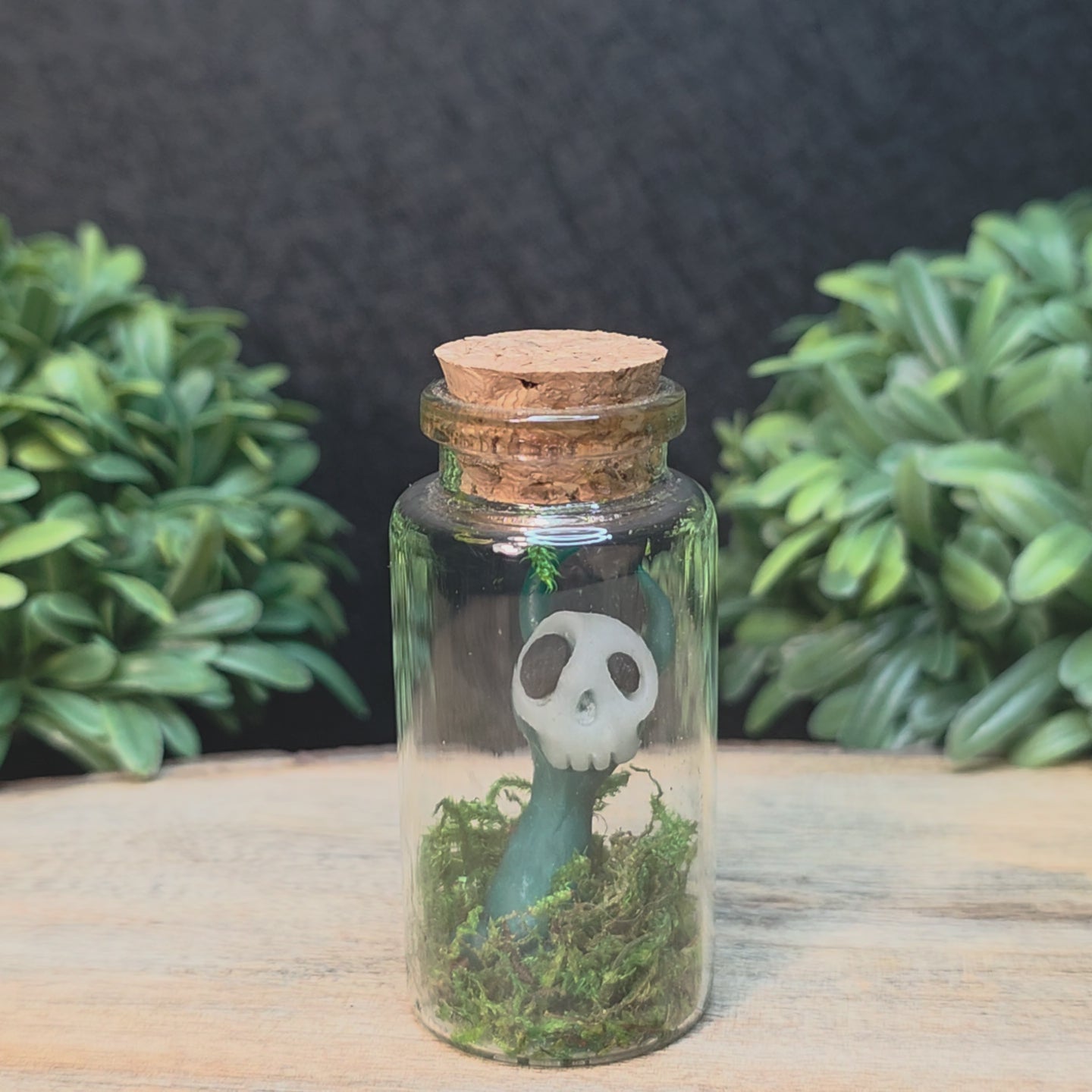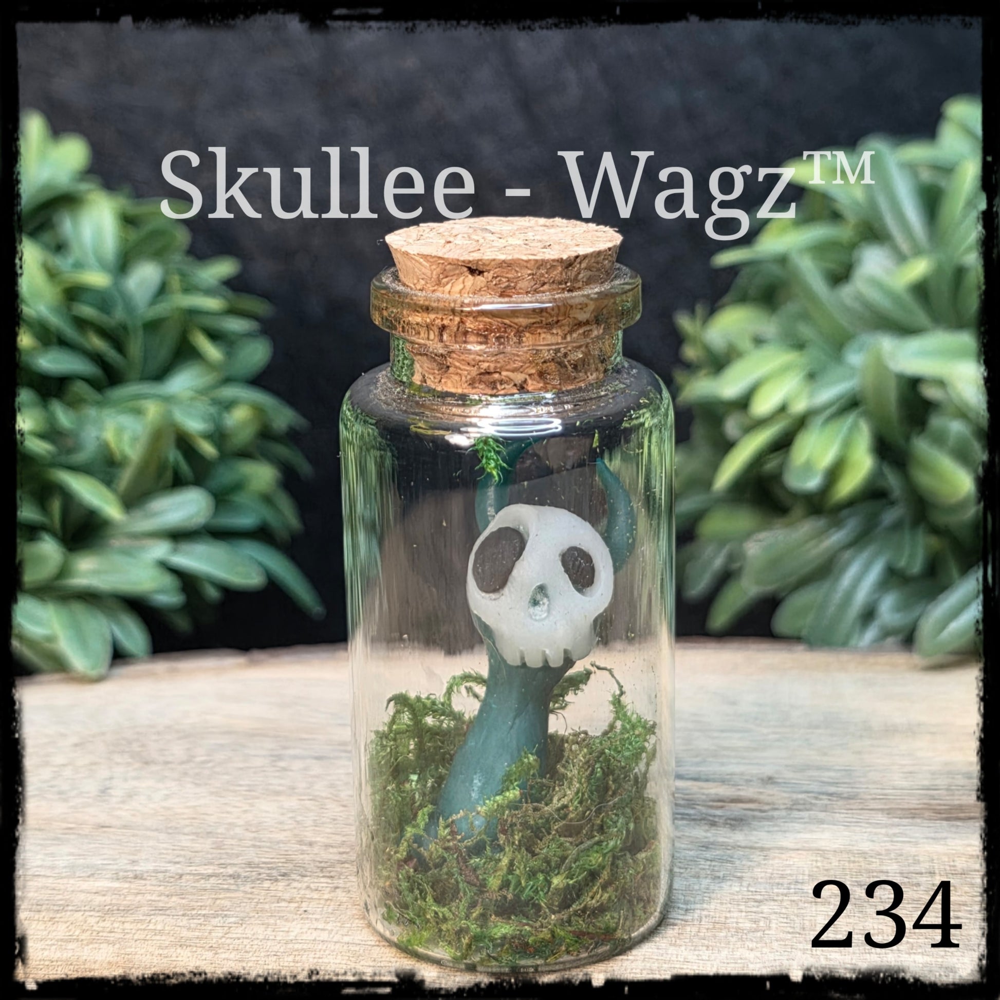 Skullee-Wagz™ are handcrafted from polymer clay. Glass jar is approximately 1 1/4 inches wide and 2 3/4 inches high and accented with moss. Do not open.