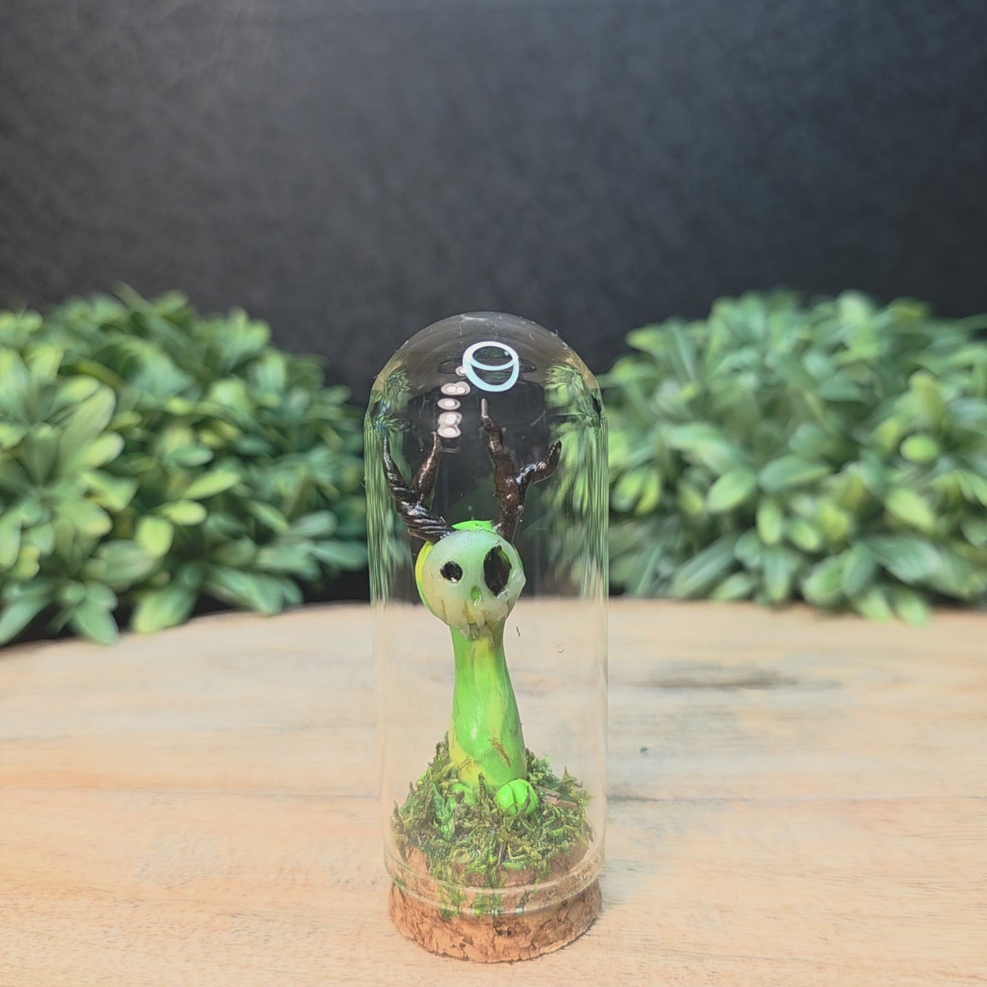 Skullee-Wagz™ are handcrafted from polymer clay. Glass dome is approximately 1 1/4 inches wide and 3 1/4 inches high and accented with moss. Do not open.