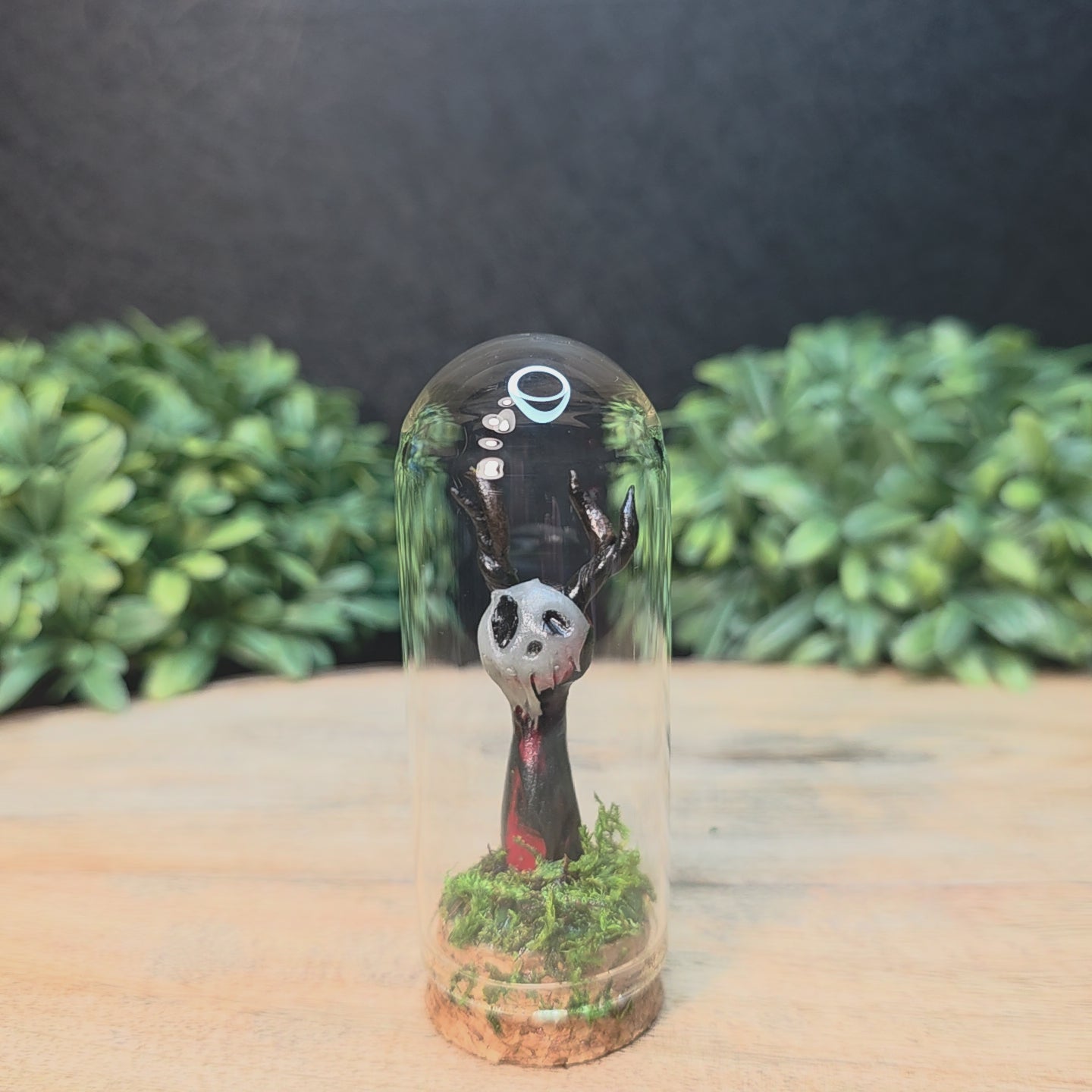 Skullee-Wagz™ are handcrafted from polymer clay. Glass dome is approximately 1 1/4 inches wide and 3 1/4 inches high and accented with moss. Do not open.