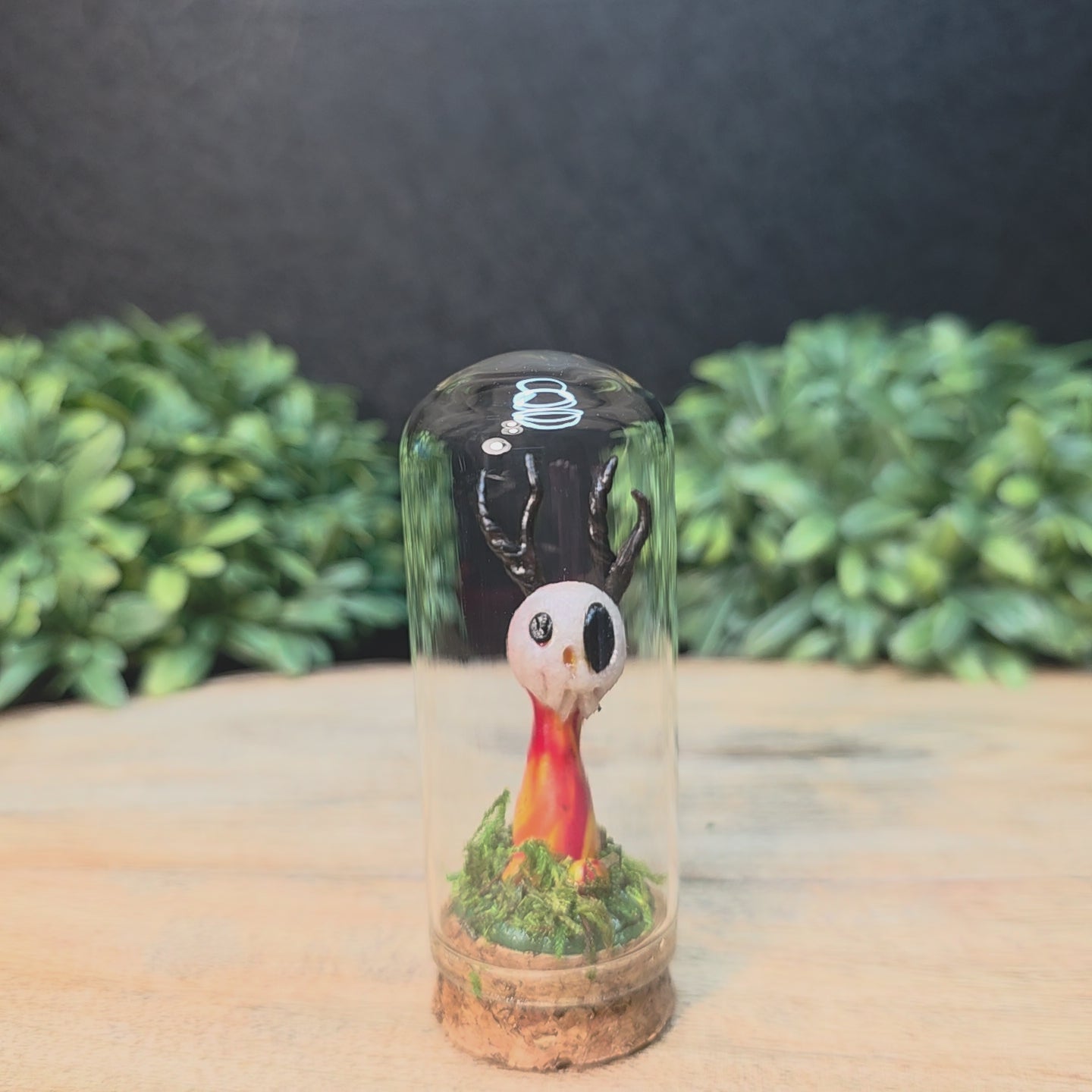 Skullee-Wagz™ are handcrafted from polymer clay. Glass dome is approximately 1 1/4 inches wide and 3 1/4 inches high and accented with moss. Do not open.