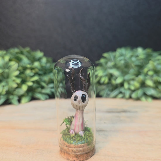 Skullee-Wagz™ are handcrafted from polymer clay. Glass dome is approximately 1 1/4 inches wide and 3 1/4 inches high and accented with moss. Do not open.