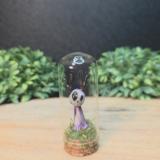 Skullee-Wagz™ are handcrafted from polymer clay. Glass dome is approximately 1 1/4 inches wide and 3 1/4 inches high and accented with moss. Do not open.