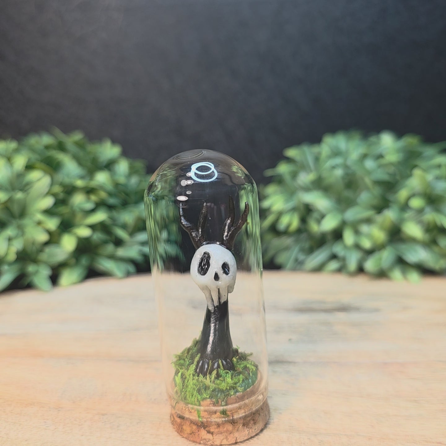 Skullee-Wagz™ are handcrafted from polymer clay. Glass dome is approximately 1 1/4 inches wide and 3 1/4 inches high and accented with moss. Do not open.
