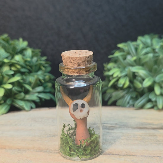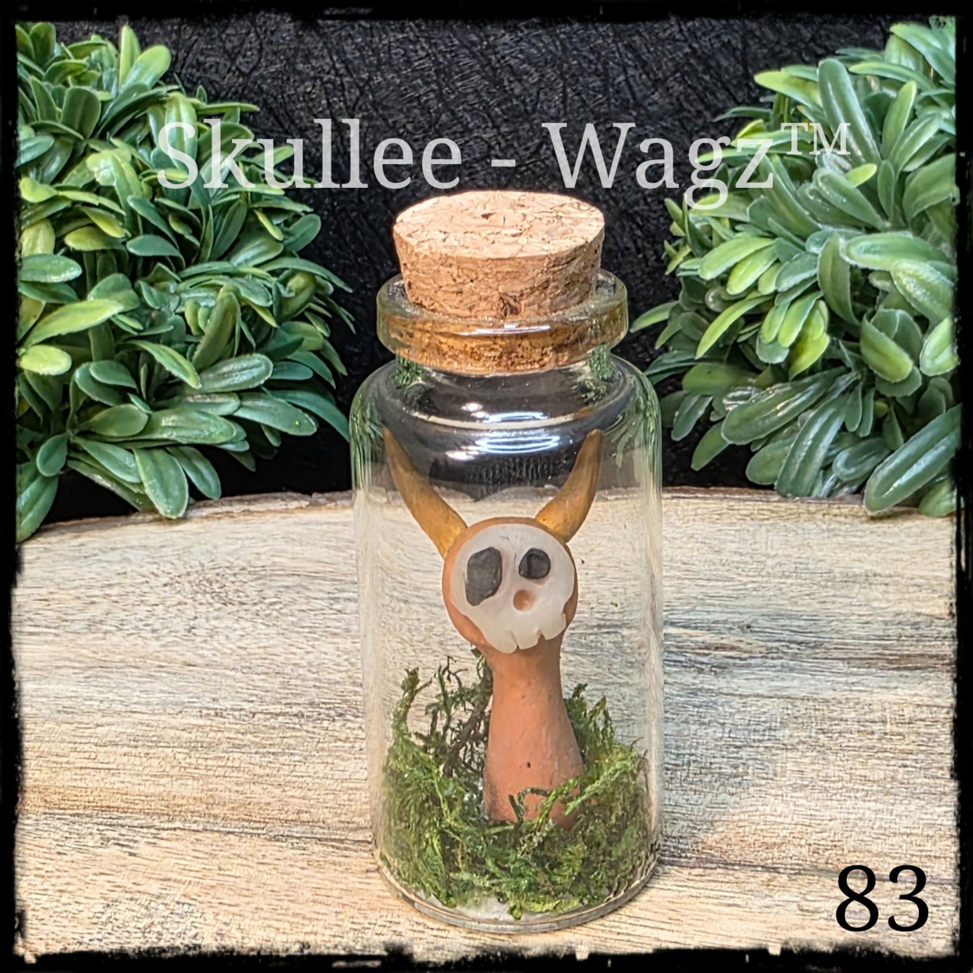 Skullee-Wagz™ are handcrafted from polymer clay. Glass jar is approximately 1 1/4 inches wide and 2 3/4 inches high and accented with moss. Do not open.