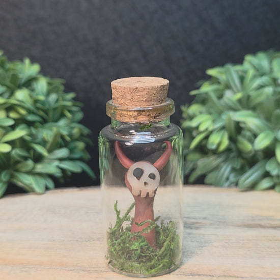 Skullee-Wagz™ are handcrafted from polymer clay. Glass jar is approximately 1 1/4 inches wide and 2 3/4 inches high and accented with moss. Do not open.