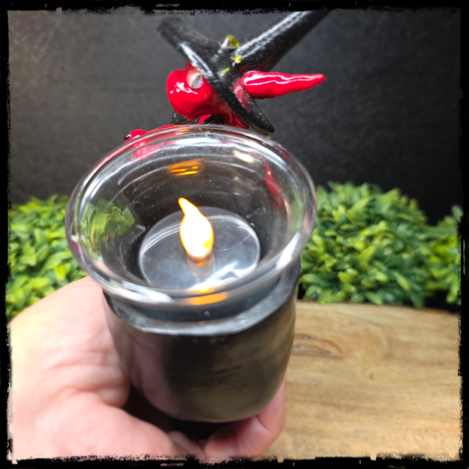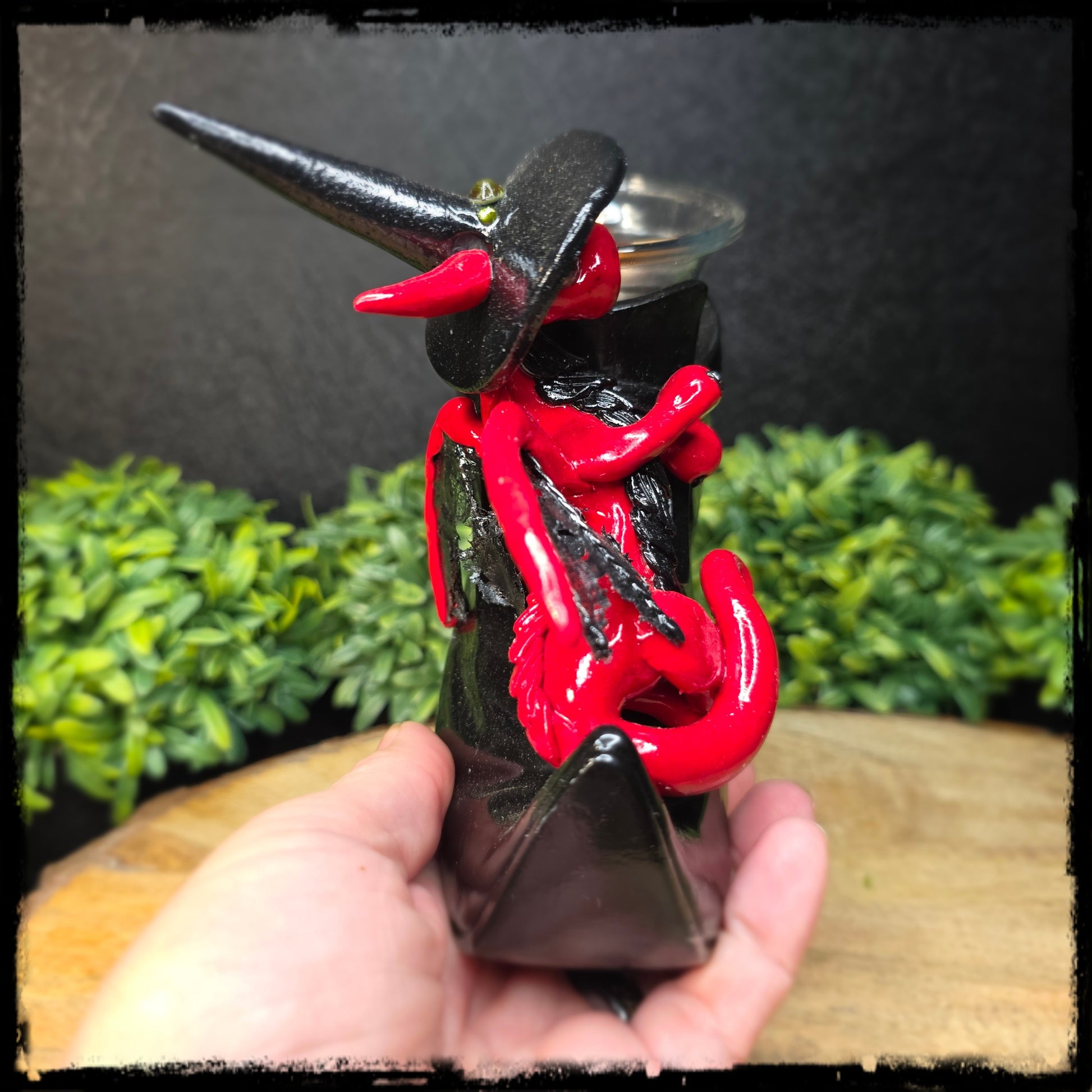 !! DO NOT USE REAL CANDLES !! This sculpture is lovingly handcrafted from polymer clay and finished with a gloss varnish. Witch's shoe candle holder is made from resin and glass. Battery operated candle included. Includes an artist signed adoption certificate of authenticity. Size of dragon is approximately 6 inches wide, and 5 1/4 inches high.